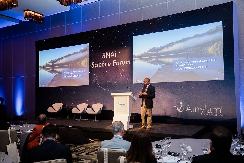 Akshay Vaishnaw, presidente de pesquisa e desenvolvimento da Alnylam Pharmaceuticals, apresentou a plataforma de RNAi em seus detalhes com uma linha do tempo desde a descoberta da possibilidade de alterações no RNA mensageiro até o medicamento propriamente dito. Pontuou, ainda, que outras áreas terapêuticas como cardiologia, hematologia, oftalmologia e hepatologia também são áreas com foco para o desenvolvimento de novas drogas através desta plataforma e estão em desenvolvimento pela Alnylam Pharmaceuticals.
